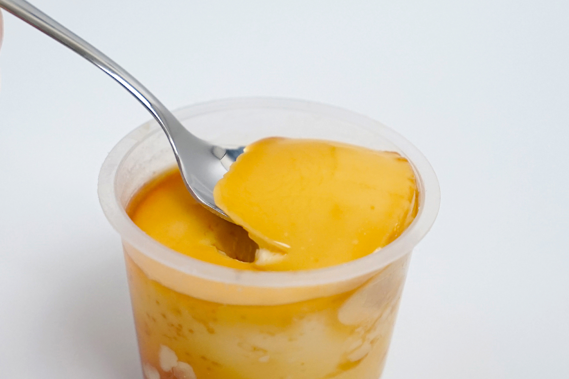 三温糖をじっくり煮詰めた濃厚なカラメルが、甘さを抑えたプリン生地に絶妙に調和します。